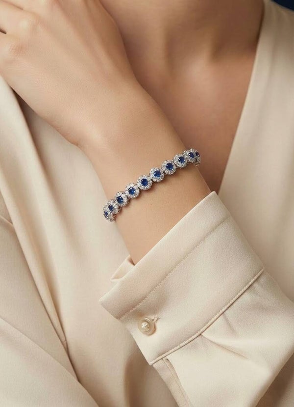 Elke diepblauwe, saffierkleurige steen in deze armband is zorgvuldig gezet in een schitterende 'halo' (een aureool) van sprankelende, briljant geslepen Diamond Simulants. Dit klassieke ontwerp benadrukt de rijke, koninklijke kleur van de stenen en zorgt voor een adembenemende lichtinval bij elke beweging van je pols. Gemaakt van hoogwaardig gerhodineerd materiaal biedt deze armband een langdurige, zilverwitte glans die de perfecte illusie van fine jewelry wekt.